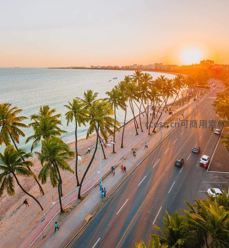 从高空俯瞰,椰林沿岸排列,金色夕阳将海面与道路染成暖色,行人车辆点缀其间,构成一幅宁静而活力的海滨城市画卷。