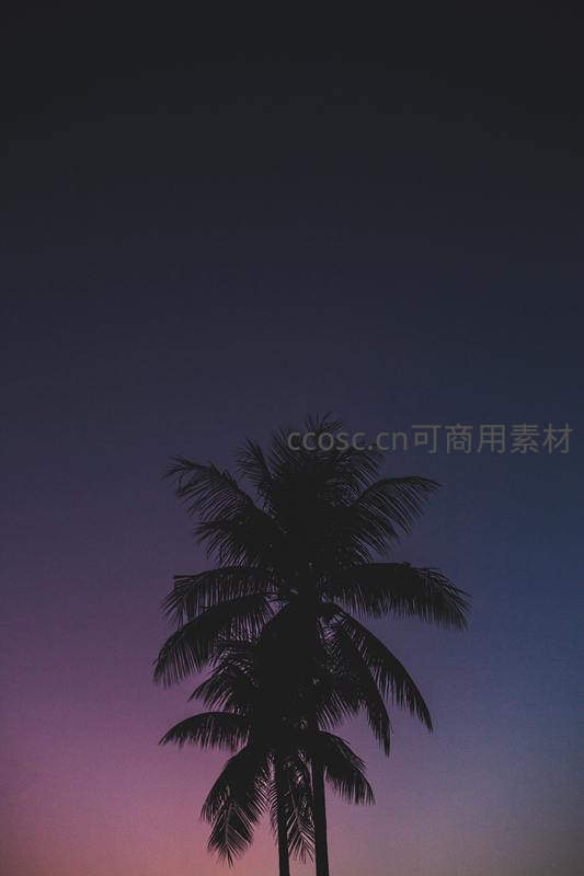 夜幕降临,一棵椰树化作黑色剪影矗立于渐变紫霞之中,天空由深蓝过渡至粉紫,营造出神秘而浪漫的黄昏诗意场景。