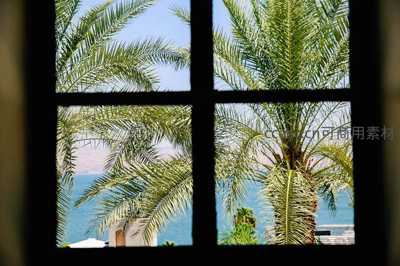 窗框构图,绿意棕榈与蔚蓝大海相映成趣