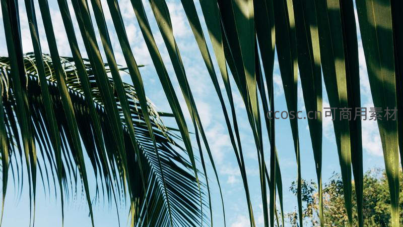 从低角度仰望,高大的椰子树叶在蔚蓝天空的背景下形成优美的剪影,营造出宁静而开阔的热带氛围。