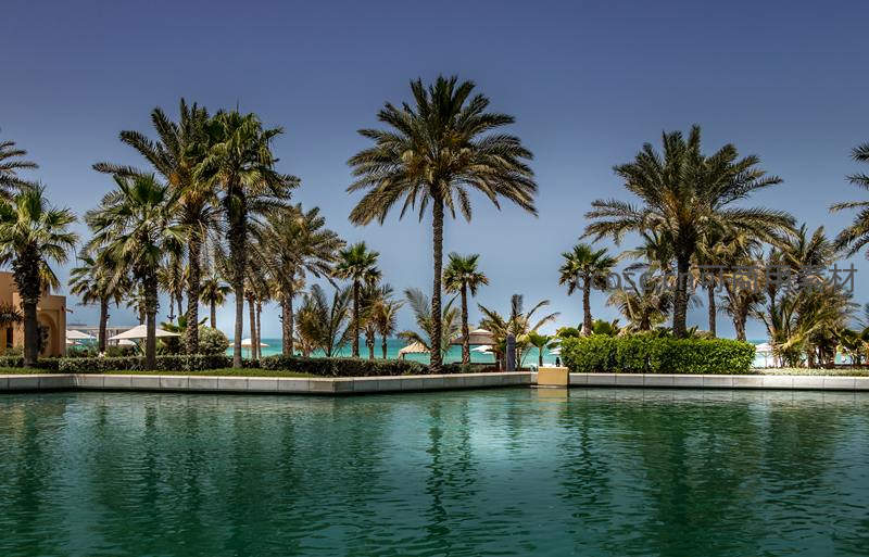 清澈泳池水面倒映着高耸的棕榈树,背景是蔚蓝天空与远处海滩,营造出宁静惬意的热带度假氛围。