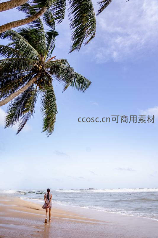 一位女子赤脚漫步在湿润的沙滩上,头顶是挂满椰果的枝叶,身后是无垠的大海,享受着惬意的海岛时光。