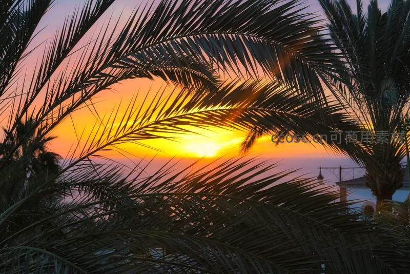 透过层层叠叠的棕榈叶缝隙,可以看到远方海平面上缓缓下沉的太阳,暖橙色的光芒洒满天空,营造出浪漫而富有层次感的热带黄昏。