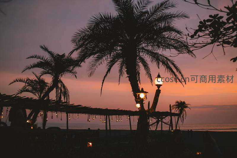 夕阳西下,紫橙色的天空下,棕榈树与悬挂着暖光灯笼的木架形成美丽剪影,营造出温馨浪漫的海滨度假氛围,令人流连忘返。