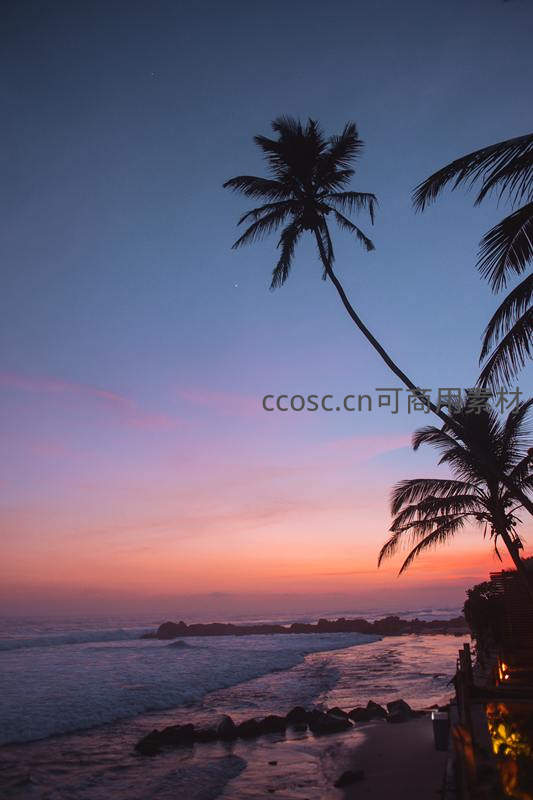 绚丽的晚霞染红天际,倾斜的棕榈树剪影矗立在海岸边,温柔的海浪轻拍礁石与沙滩,整个画面弥漫着静谧而浪漫的黄昏情调。
