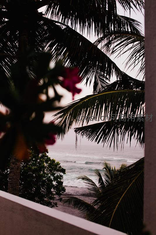透过棕榈叶的缝隙,远眺波光粼粼的大海与天空相接,粉紫色的晚霞渲染天际,营造出宁静浪漫的热带度假氛围。