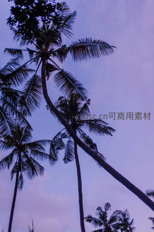 深蓝紫的暮色天空下,几棵高耸的椰树形成优雅的黑色剪影,枝叶舒展如画,展现热带黄昏特有的静谧与诗意。