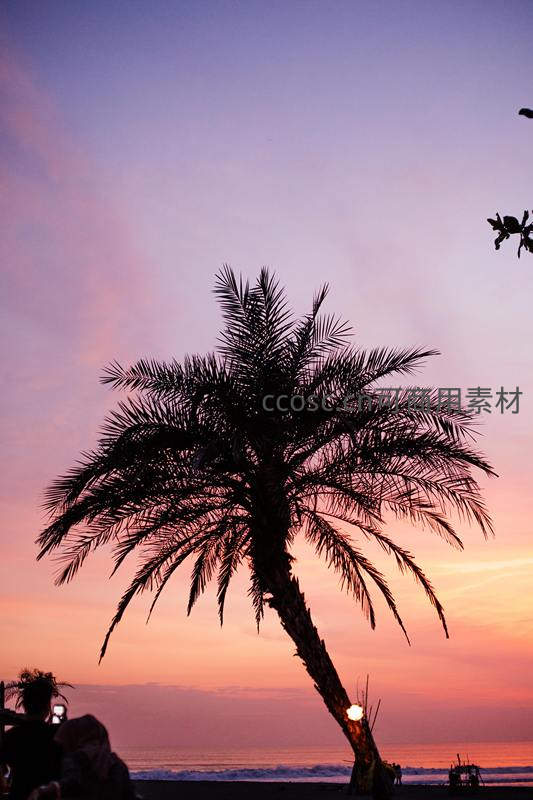 一棵倾斜的椰树在绚烂橙红的落日余晖中化为剪影,海面波光粼粼,远处人影朦胧,构成一幅充满异域风情的浪漫画卷。