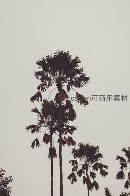 灰白色调的天空背景下,几株形态独特的棕榈树呈现出深邃的剪影,整体画面带有怀旧的胶片质感,充满艺术气息。
