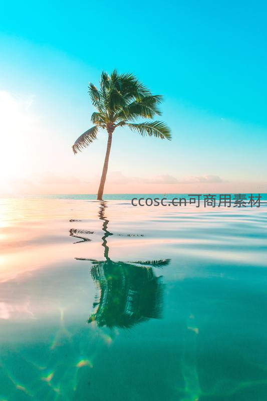 碧海蓝天中倒影的孤寂椰树