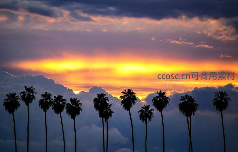 一排高耸的椰树在绚烂的晚霞下形成黑色剪影,橙黄与紫灰交织的云层铺满天际,营造出宁静而壮丽的热带黄昏景象。