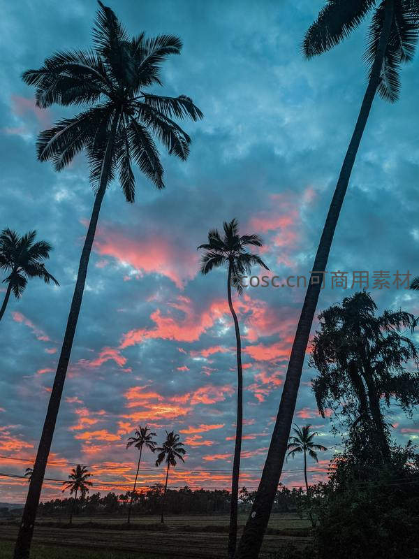 多棵高大的椰树剪影错落有致地排列在色彩斑斓的火烧云之下,下方是开阔的田野,构成一幅充满戏剧张力的热带黄昏画卷。
