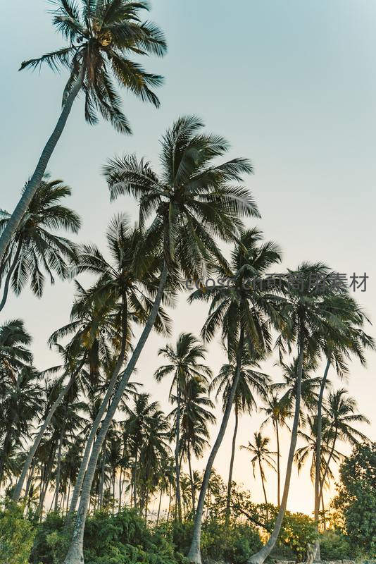 成排的椰子树在温柔的夕阳余晖中矗立,金色光芒勾勒出它们优雅的轮廓,营造出浪漫的热带黄昏氛围。