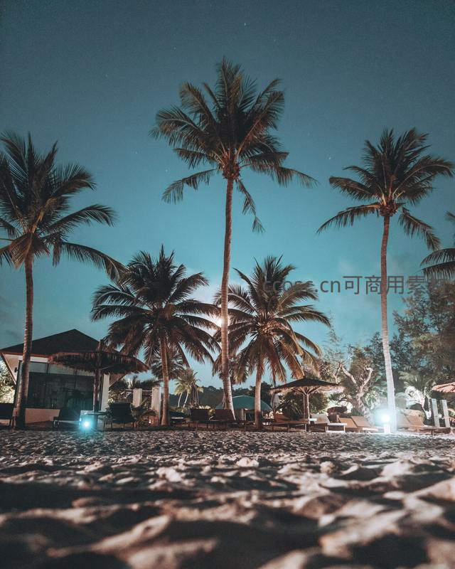 夜晚的沙滩上,高大的棕榈树在星光下静静伫立,远处度假村的暖黄灯光温柔地照亮了沙滩和躺椅,营造出浪漫而安宁的氛围。