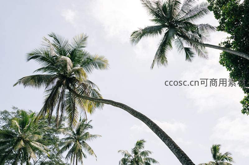 高耸的椰子树在晴朗的蓝天下舒展枝叶,构成一幅充满热带风情的自然画卷,令人心旷神怡。