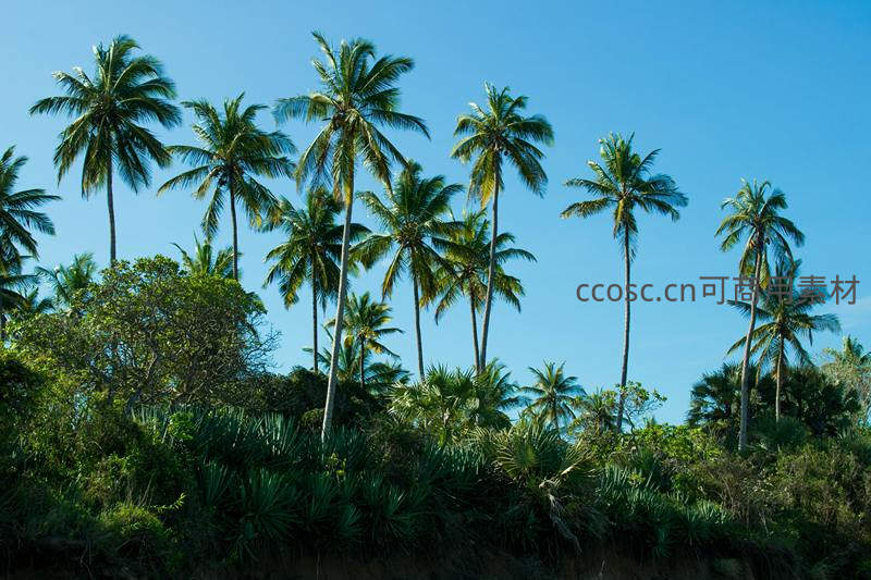 一排排挺拔的椰子树矗立在碧空之下,与茂密的绿色植被相映成趣,展现出浓郁的热带岛屿风情。