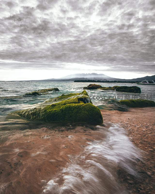 海浪轻抚长满青苔的礁石