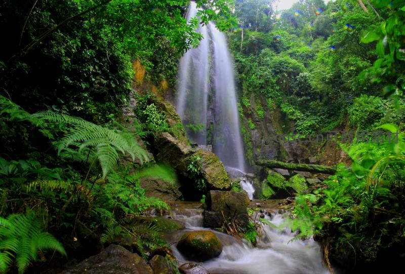 热带雨林瀑布飞泻,绿植环绕生机勃勃