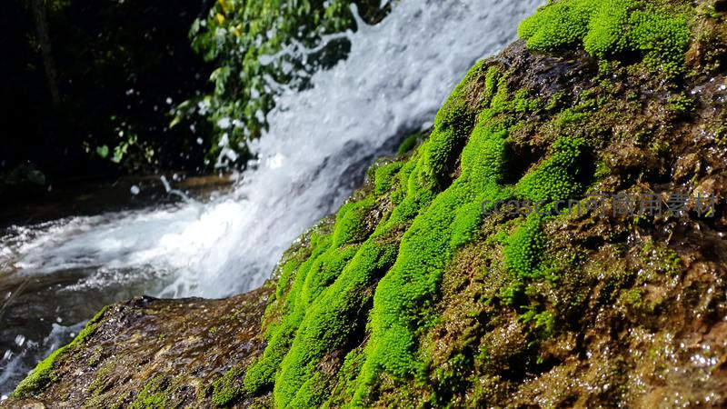 瀑布溅水击石,青苔如绒,生机盎然