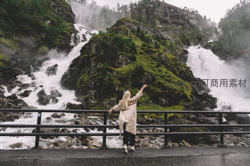 一位女子背对镜头,在壮观瀑布前张开双臂,享受水雾扑面而来的感觉,体现人与自然融合的壮阔与自由。