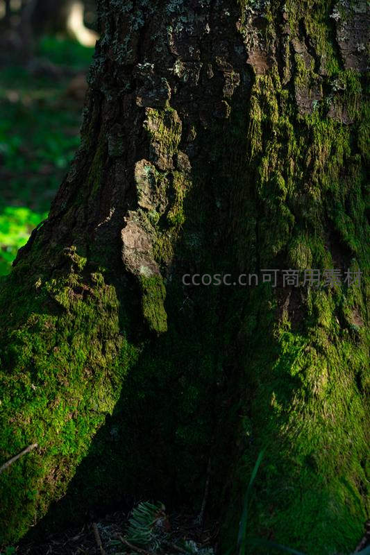 一束阳光斜照在古老树干上,明暗对比强烈,青苔在光线下显得格外鲜绿,树皮沟壑纵横,背景虚化,营造出神秘而宁静的森林氛围。
