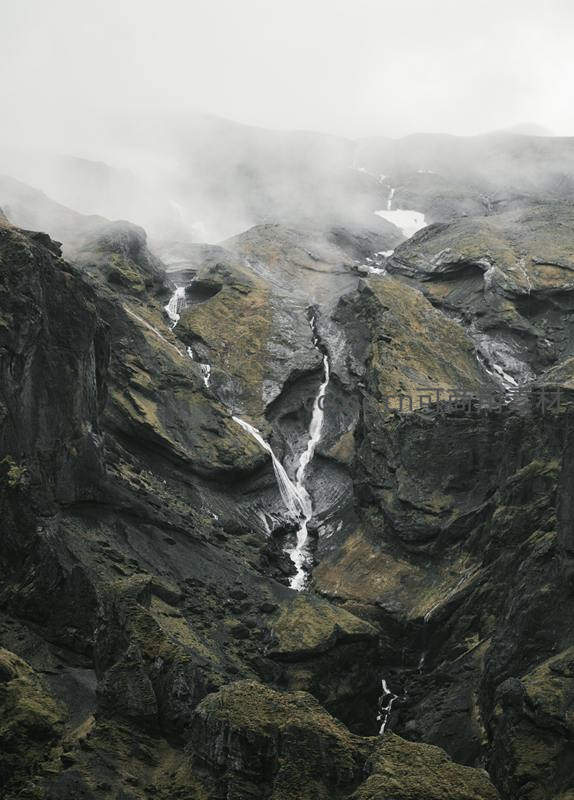 浓雾弥漫的深谷中,多条细小瀑布从灰黑色岩壁上蜿蜒流下,与斑驳苔藓交织,营造出一种苍茫、孤寂又充满原始力量的氛围。
