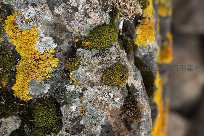 镜头聚焦于岩石表面,黄绿相间的地衣如同天然的调色盘,在粗糙的石面上形成精美的图案,展现了微观世界的奇妙与美丽。