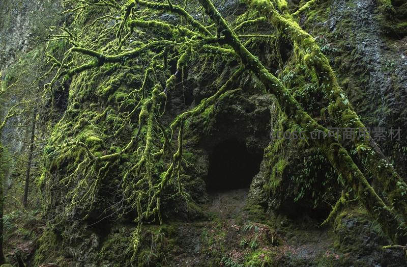 古老岩壁与盘根错节的苔藓枝条共同守护着幽深洞口,营造出如童话般的神秘氛围,引人探索未知。