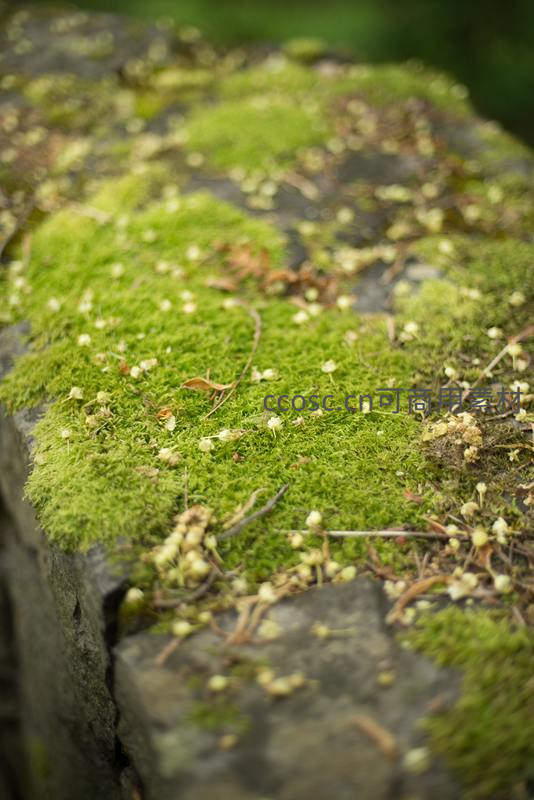 细腻苔藓铺满石缝,点缀着星星点点的小白花,展现微观世界中的蓬勃生机与宁静诗意之美。