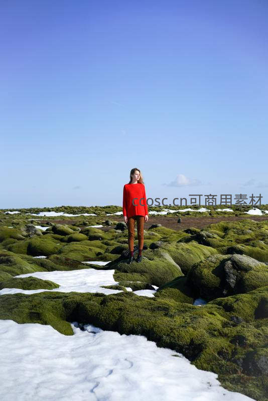 一位身着红衣的女子伫立在绿苔与白雪交织的广袤原野上,鲜明色彩对比突显人与自然和谐共存的画面。