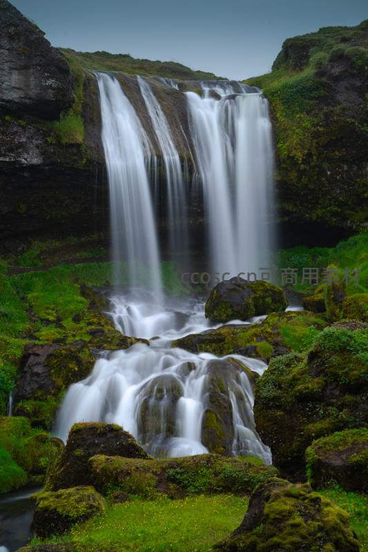 采用慢门拍摄,使瀑布水流呈现出如丝绸般的柔滑质感,两侧覆盖青苔的黑色岩石与鲜绿草地形成鲜明对比,营造出宁静致远的自然意境。