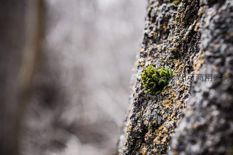 在粗糙斑驳的岩石缝隙中,一簇鲜绿的苔藓顽强生长,展现了微小生命在严酷环境中不屈不挠的惊人生命力。