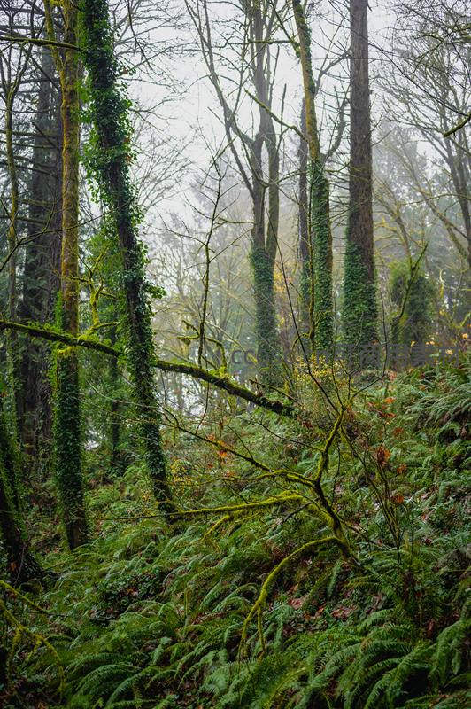 薄雾笼罩的雨林里,高大树木被浓密藤蔓和青苔包裹,地面铺满蕨类植物,营造出一片潮湿、幽深且充满原始气息的秘境。