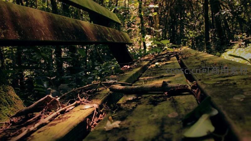 一座被遗忘在密林中的旧木桥,桥面覆盖着厚厚的青苔和落叶,阳光透过树冠洒下斑驳光影,营造出静谧而神秘的氛围。