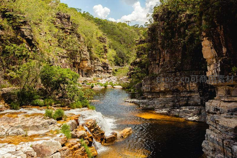清澈的溪水蜿蜒流淌在陡峭的岩壁峡谷中,水流轻拍岩石激起白色浪花,两岸绿树葱茏,蓝天白云映衬,展现壮丽的自然景观。