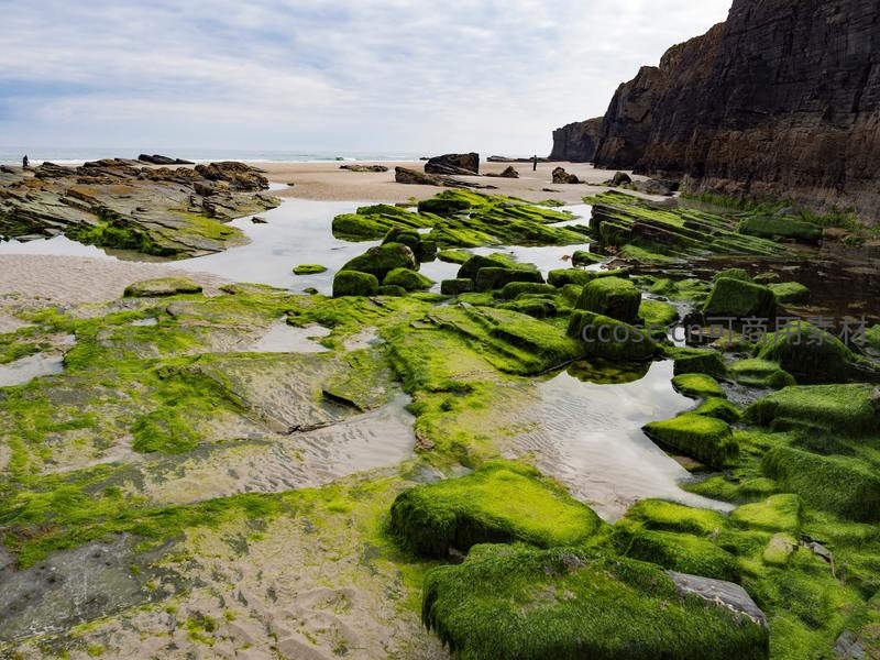 退潮后的海岸线,大片岩石被鲜亮的绿藻覆盖,形成独特的绿色地貌,远处沙滩与悬崖相接,展现潮间带丰富多样的自然生态。