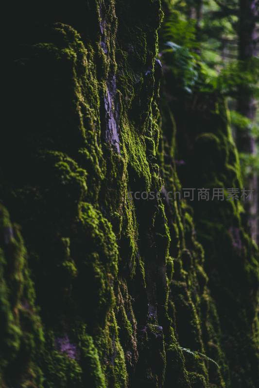 镜头聚焦于覆盖着浓密青苔的树干,展现其细腻的纹理与生机勃勃的绿色,营造出幽静深邃的森林氛围。
