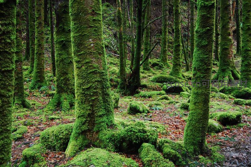 粗壮的树干和根部完全被鲜绿的苔藓覆盖,落叶铺满地面,整个画面散发着潮湿、古老而神秘的森林气息。