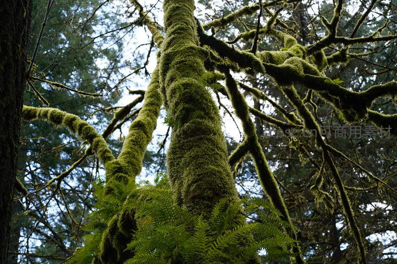 从低角度仰望,粗壮的树干与枝桠被厚厚的绿色苔藓完全包裹,阳光透过林冠洒下斑驳光影,展现出原始森林的静谧与生命力。