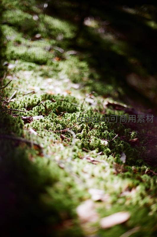 阳光穿过茂密树冠,在铺满翠绿苔藓的林地上投下跳跃的光斑,浅景深效果突出了苔藓的细腻质感,营造出梦幻般的森林秘境。