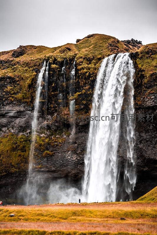 巨大的瀑布从长满苔藓的黑色悬崖峭壁轰然坠落,水雾弥漫,下方草地金黄,展现大自然磅礴的力量与壮美。