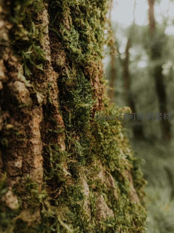 粗糙树皮的裂隙中,青苔如绒毯般蔓延生长,柔软的绿色与坚硬的木质形成强烈质感对比,体现自然共生的和谐之美。