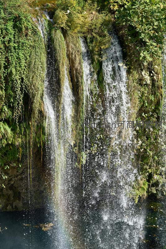 水流从绿植覆盖的崖壁轻柔滑落,阳光折射出隐约彩虹,水珠飞溅如珠帘,营造出清新湿润、生机盎然的森林瀑布秘境。