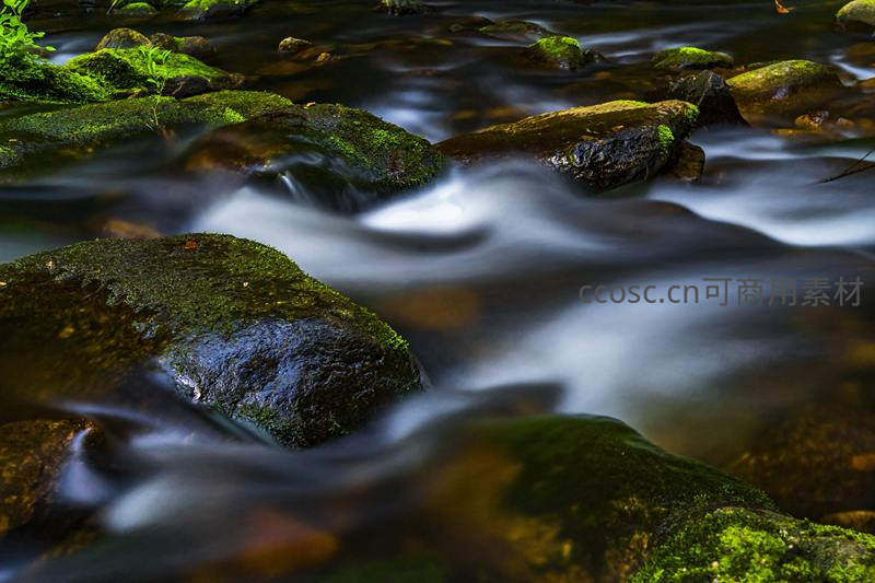 溪水温柔地绕过布满青苔的光滑石块,长曝光使水流呈现乳白色丝带状,与深色岩石和翠绿苔藓形成鲜明对比,充满诗意与宁静感。