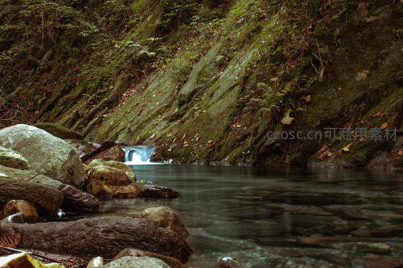 溪谷深处静谧流水与苔藓覆盖的石岸