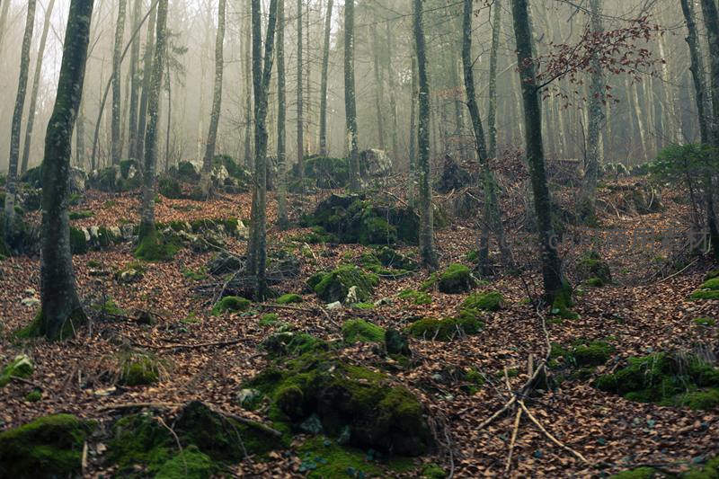 晨雾轻柔地笼罩着整片森林,地面铺满枯黄落叶与翠绿苔藓,光秃的树干静默伫立,营造出神秘而宁静的秋冬意境。