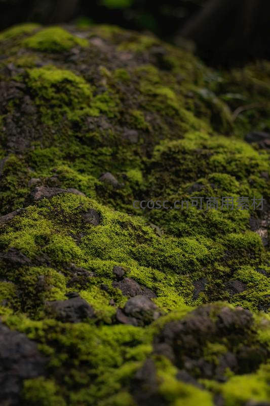 浓密鲜亮的绿色苔藓如地毯般铺满深色岩石表面,凹凸不平的纹理在柔和光线下清晰可见,彰显生命在贫瘠环境中顽强生长的原始力量与美感。