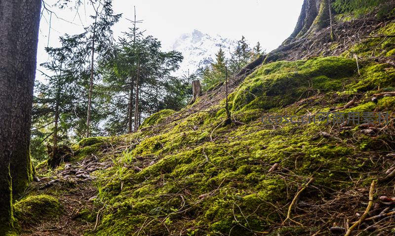 翠绿苔藓铺满林间斜坡,细枝落叶点缀其间,远处高耸的雪山在云雾中若隐若现,展现原始森林与高山的壮丽交融。