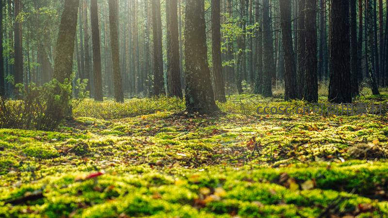 晨光穿林照苔地,松林静谧如画