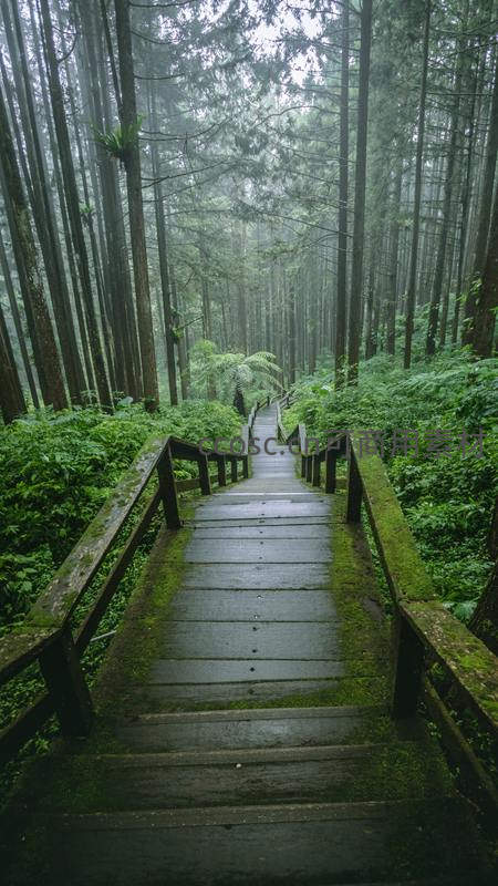 一条湿漉漉的木质栈道蜿蜒穿过浓雾弥漫的原始森林,两侧栏杆和台阶上长满青苔,营造出一种神秘、湿润且充满生机的氛围。